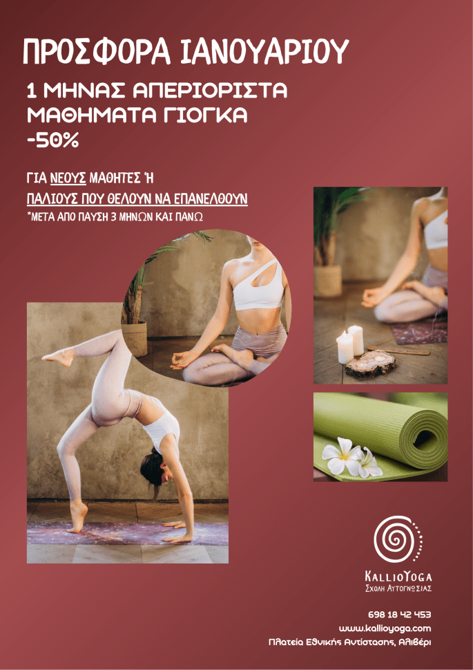 Ο Ιανουάριος είναι η ιδανική στιγμή για να κάνεις ένα νέο ξεκίνημα ή να επιστρέψεις στην πρακτική σου μετά τις διακοπές! Αν είσαι νέος μαθητής και θες να ξεκινήσεις τώρα γιόγκα ή έχεις ξανακάνει και πέρασαν τρεις μήνες ή περισσότερο που δεν παρακολουθείς μαθήματα, η προσφορά μας σε αφορά και σου δίνει την ευκαιρία να … Συνεχίστε να διαβάζετε Προσφορά Ιανουαρίου για να μπεις πάλι στην ροή!.