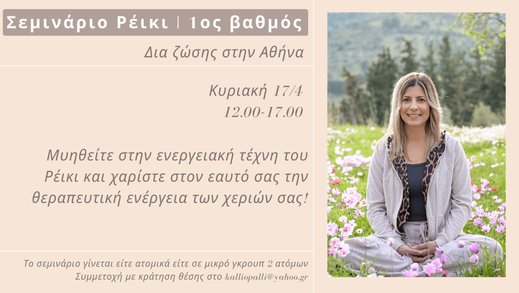 Αν θες να μάθεις περισσότερα για το θεραπευτικό άγγιγμα, ακολούθησέ μας στο σεμινάριο Ρέικι 1ου βαθμού, που θα γίνει δια ζώσης στην Αθήνα σε μικρό γκρουπ των 2 ατόμων την Κυριακή 17/4.