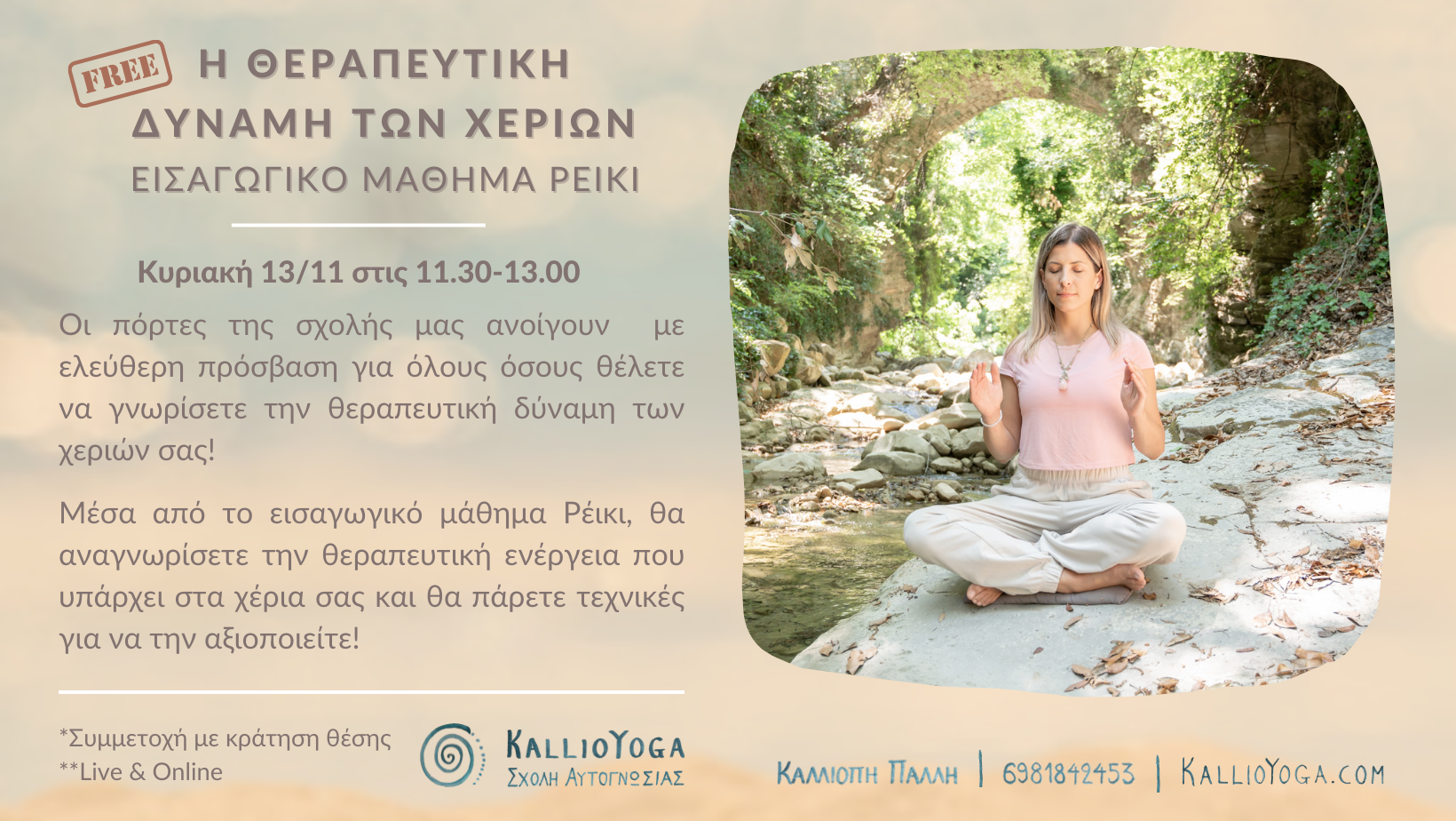 Την Κυριακή 13/11 θα ανταμώσουμε για ένα δωρεάν εισαγωγικό μάθημα ρέικι, μέσα από το οποίο θα έχεις την ευκαιρία να αναγνωρίσεις την θεραπευτική δύναμη των χεριών σου και θα λάβεις τεχνικές που θα σε βοηθήσουν να μεταφέρεις θεραπεία και ανακούφιση όπου το χρειάζεσαι!
