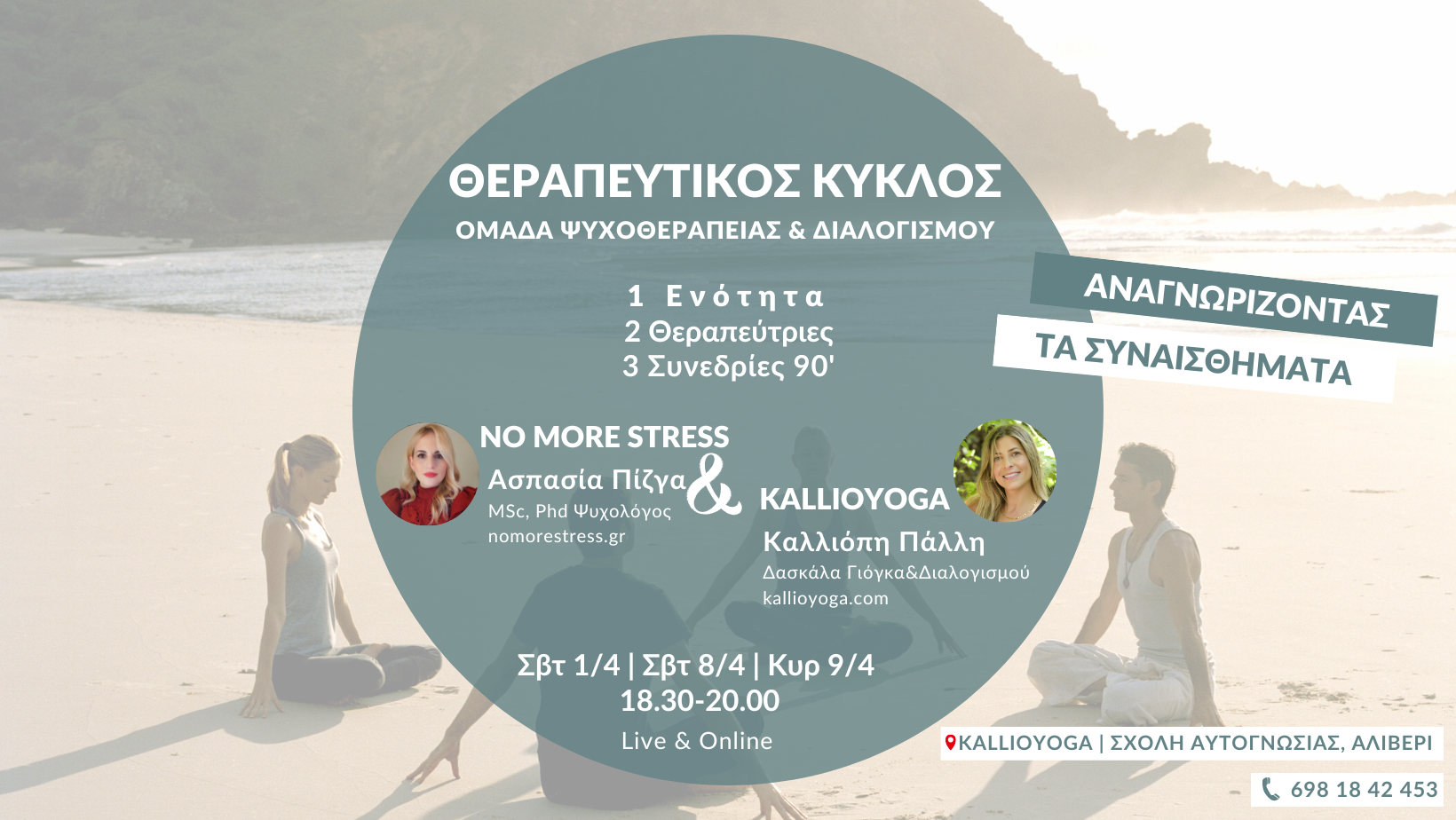 Για περισσότερες πληροφορίες και κράτηση θέσης στον θεραπευτικό κύκλο, επικοινωνήστε μαζί μας στο kalliopalli@yahoo.gr ή 6981842453.