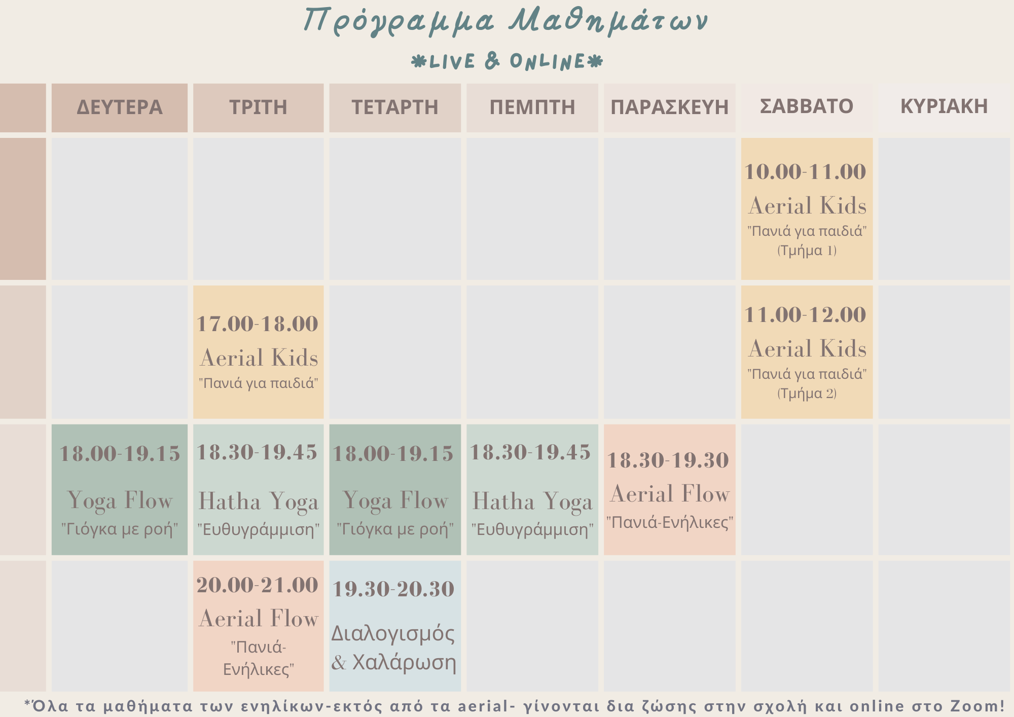 Όλα τα μαθήματα απευθύνονται σε όλα τα επίπεδα ασκουμένων έχοντας προοδευτική ροή.