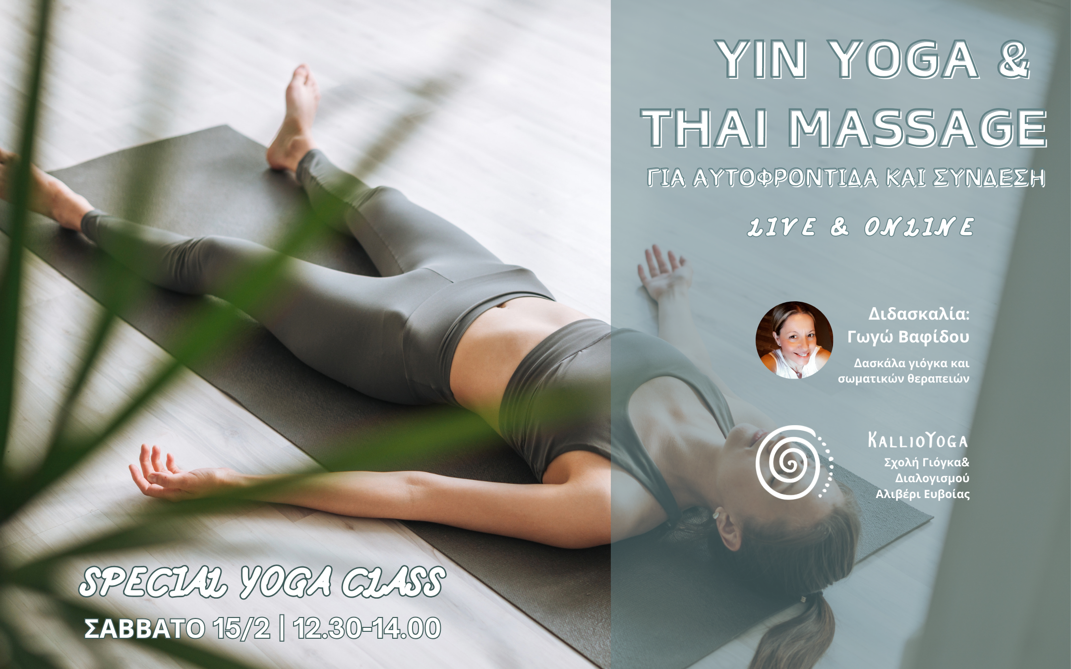 Σε αυτό το ξεχωριστό μάθημα, θα βιώσουμε την βαθιά ηρεμία της Yin Yoga και θα ανταλλάξουμε φροντίδα μέσα από το Thai Massage!