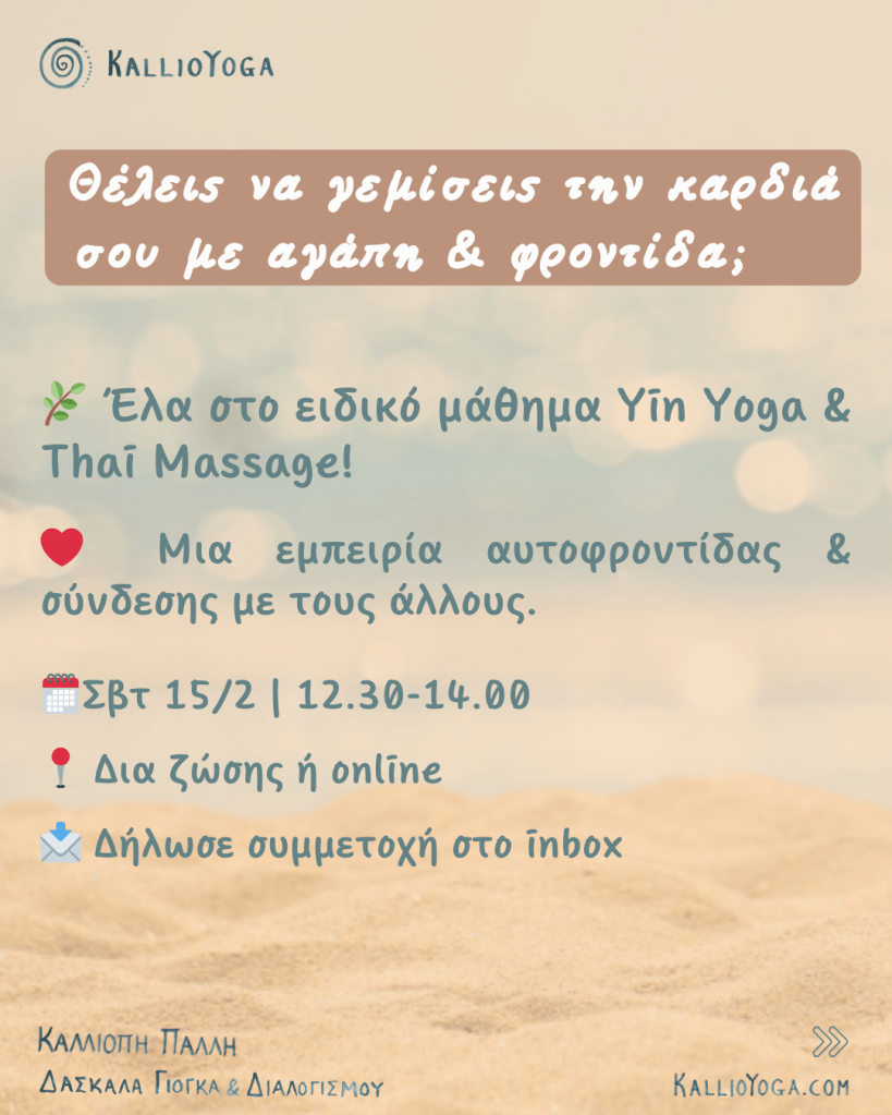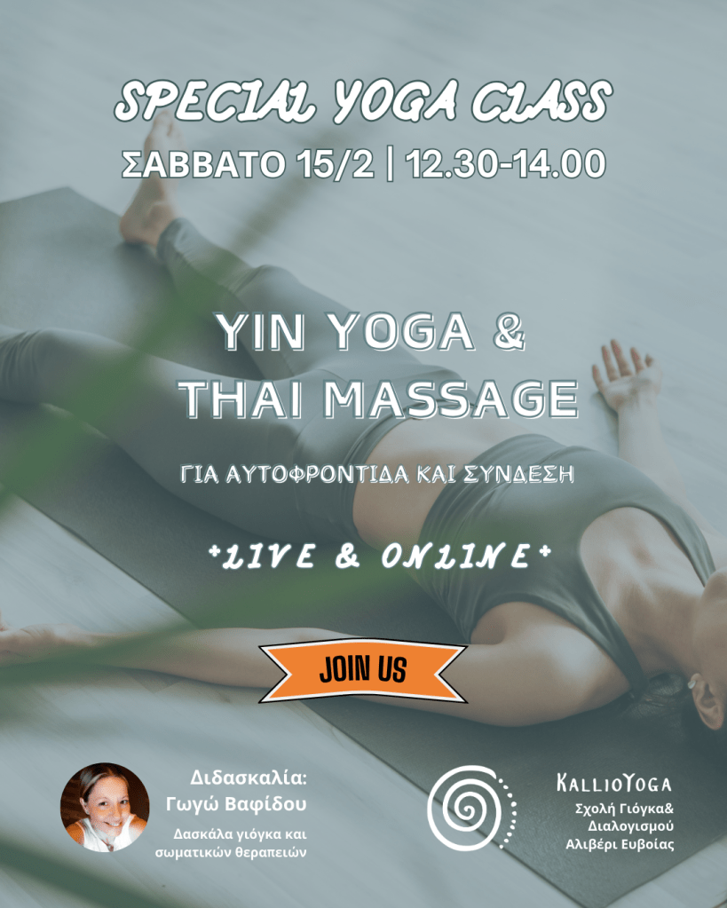 ✨Σε αυτό το εργαστήριο 1,5 ώρας, θα βιώσετε την βαθιά χαλάρωση της Yin Yoga και την ευδαιμονία του Thai Massage, επιτρέποντας στο σώμα να βρει μια βαθύτερη αίσθηση ευκολίας & ισορροπίας.
