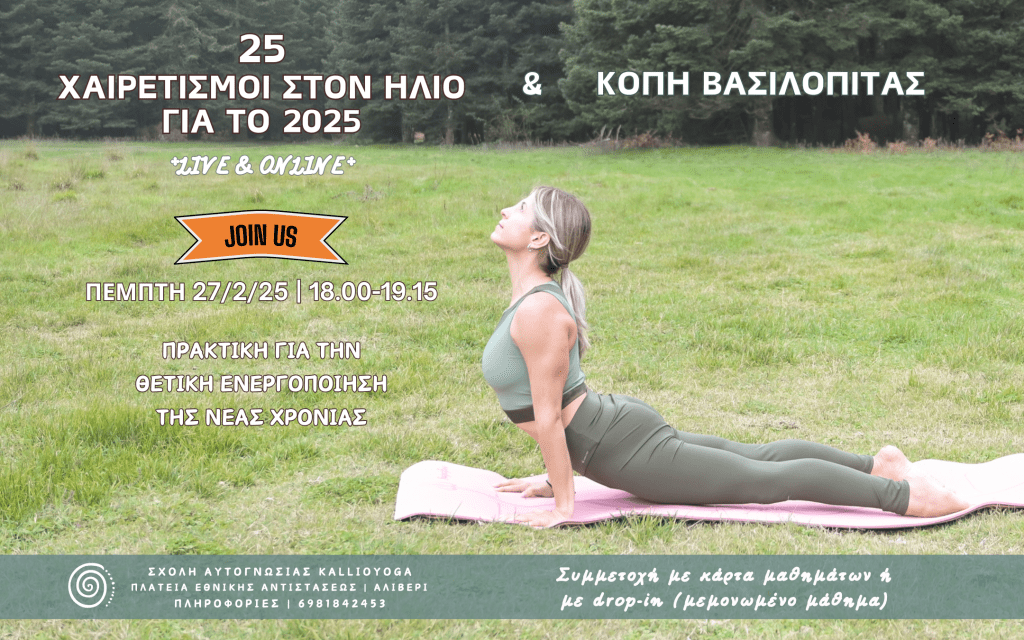 Στο ειδικό μάθημα «25 Χαιρετισμοί στον Ήλιο για το 2025», θα κινηθούμε με ρυθμό και αναπνοή, δημιουργώντας ζεστασιά, ευλυγισία και αντοχή, ενώ παράλληλα θα συνδεθούμε με την ισχυρή πρόθεση της καρδιάς για την νέα χρονιά!