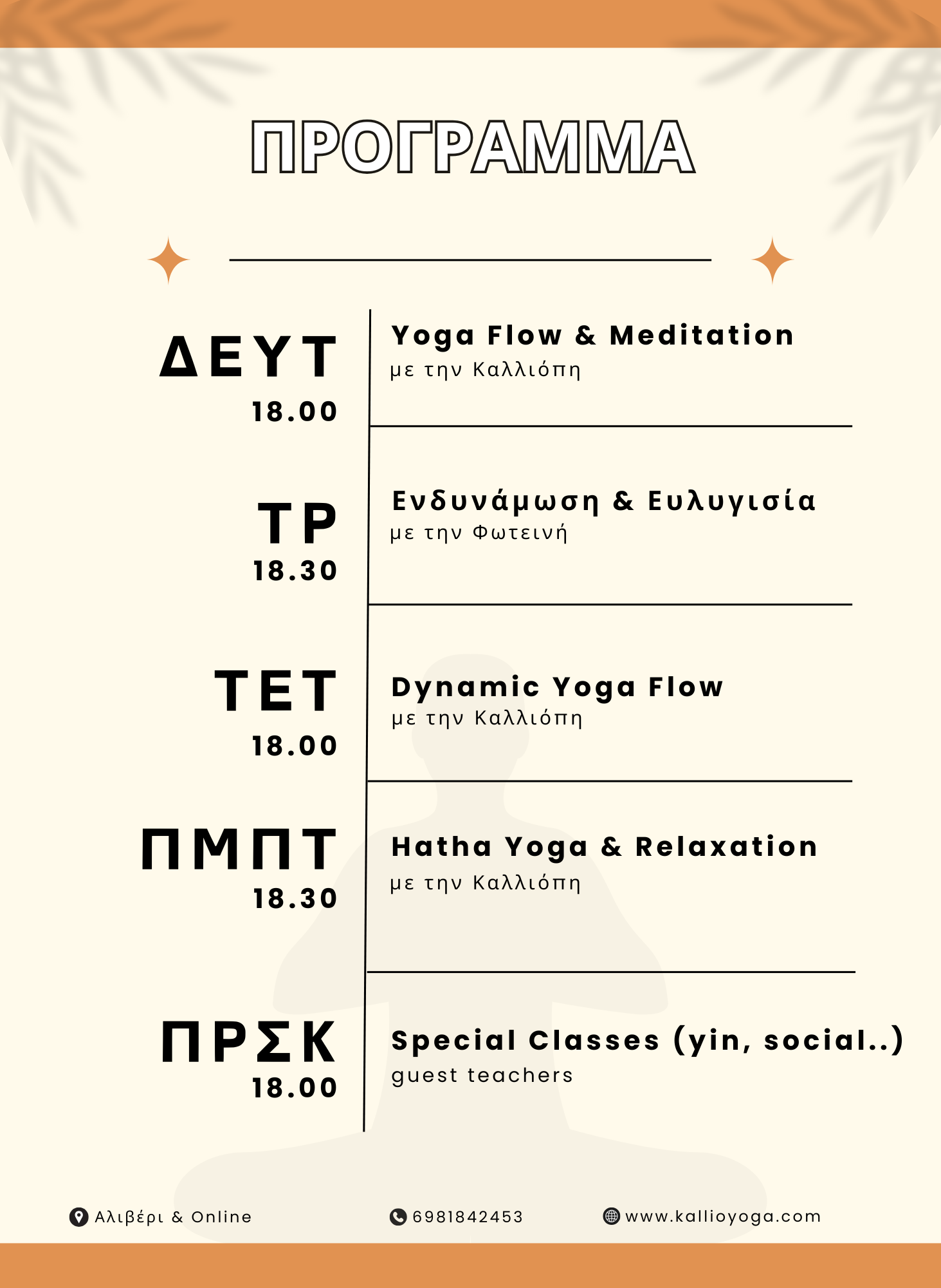 – Δευτέρα 18.00–19.15: Yoga Flow & Meditation (με την Καλλιόπη)