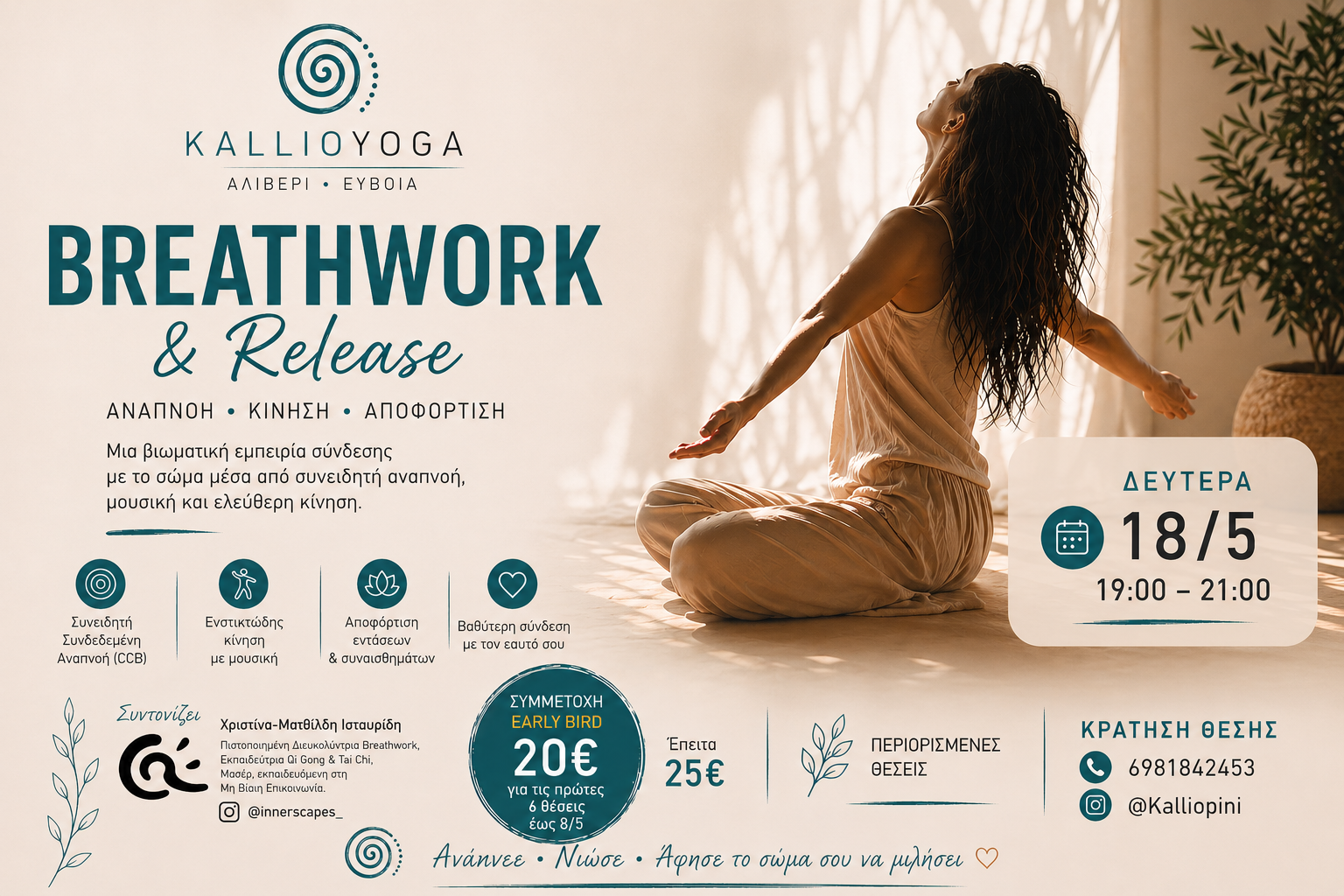 Το KallioYoga σας προσκαλεί σε ένα ξεχωριστό βιωματικό εργαστήριο Breathwork & Release, την Δευτέρα 18/5, ώρα 19:00 – 21:00, στον χώρο μας στο Αλιβέρι Ευβοίας.