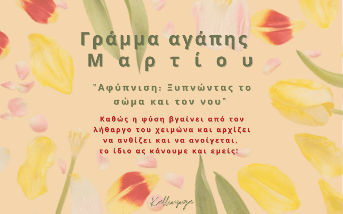 Καλό μήνα αγαπημένοι μου! Χαρούμενο Μάρτη με φως, ελπίδα, αισιοδοξία, ομορφιά, ανοιχτωσιά και δύναμη! Καθώς η φύση σταδιακά βγαίνει από τον λήθαργο του χειμώνα και οδεύει προς το φως και την ζωντάνια της άνοιξης, το ίδιο ας κάνουμε και εμείς ως φυσικοί οργανισμοί! Η ζωή προχωράει! Η φύση ανθίζει! Το φως και η μέρα μεγαλώνει! … Συνεχίστε να διαβάζετε Γράμμα Αγάπης Μαρτίου.